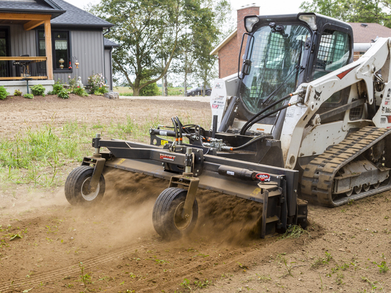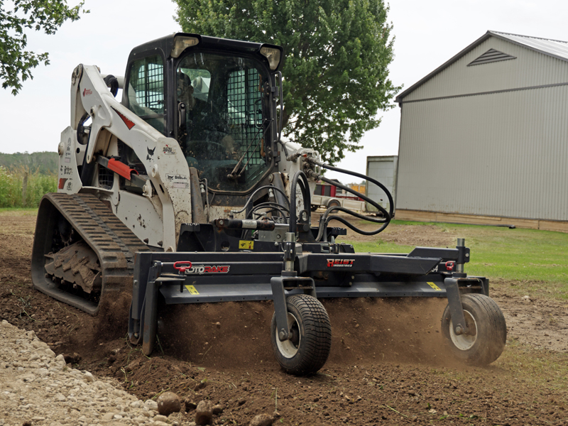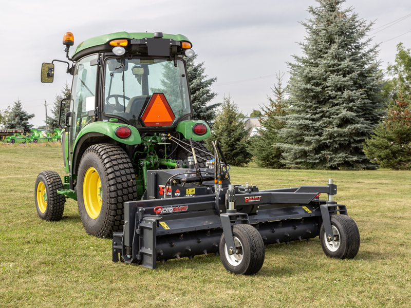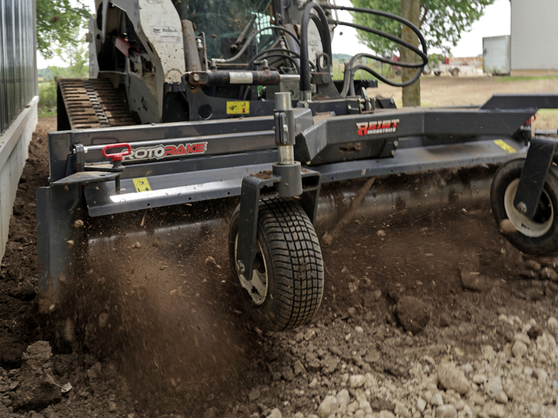 The RotoRake also features a floating rotor design with road-grade mini carbide teeth, ditch cutters and side shields. The RotoRake can be used on a three point hitch or skid steer hitch systems.